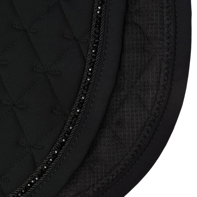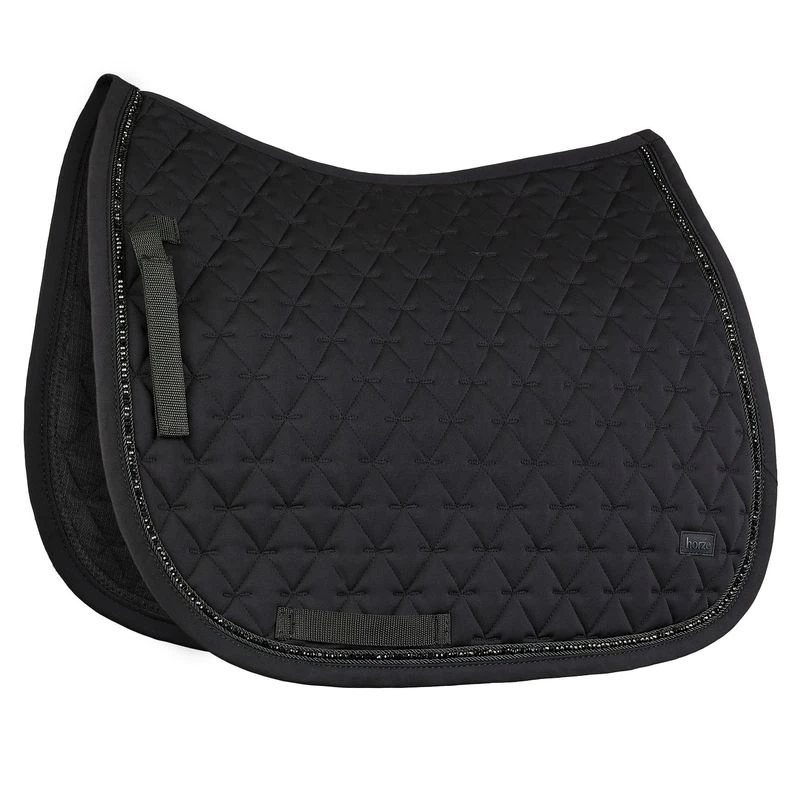 The Horze Noir saddle pad is made from soft outer material with elegant diamond quilting to relieve pressure beneath the saddle. Waffle lining wicks away any moisture, and straps attach easily to your saddle. Two rows of pretty cord and a row of shiny pearls around the edges add a touch of luxury to this saddle pad.