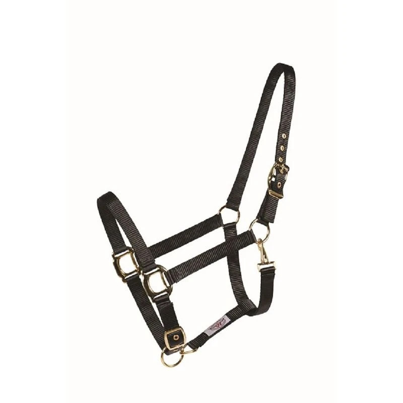 A glossy nylon halter available in a variety of colors and with 2 ply construction and brass plated zinc die cast hardware.